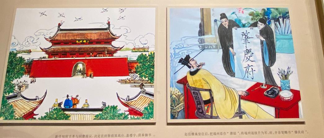 史料记载,肇庆古称端州,是当时端王赵佶的封地。赵佶登基做皇帝后,将端州升为兴庆府,在重和元年改为肇庆府,并亲笔题写“肇庆府”府额赐给当地守臣。守臣在府署前建造两丈高的高台,上建门楼,供奉御书匾额,名曰“御书楼”,也就是现在的丽谯楼。肇庆也因此而得名,沿用至今。
