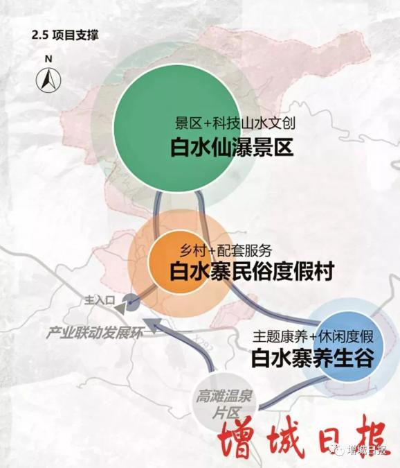 项目引进国内知名品牌旅游企业,规划以白水寨景区提质为重点,设计3大主题和29个项目,整体打造以白水寨景区(核心)、养生谷、民俗村三大功能板块,打造广州首个5A文旅生态健康产业项目,构建广州世界级文旅产业地标。