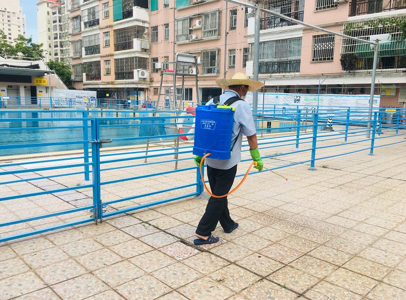 端州游泳场负责人告诉记者,馆内外每天都会进行两次消毒喷洒。室内泳池增加了排气扇,保持空气流通。