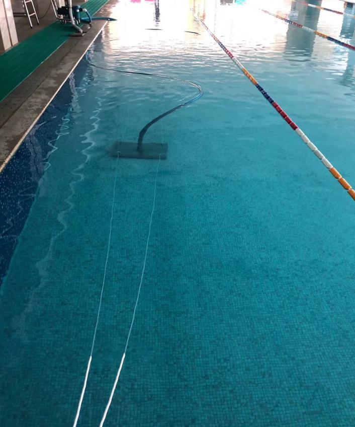 进场后,记者看到泳池暂停营业并进行清洁消毒。只见游泳馆工作人员背着消毒箱,从泳池边、更衣室、卫生间等进行一次消毒。期间,工作人员也在泳池放置吸尘器,保持泳池内清洁。