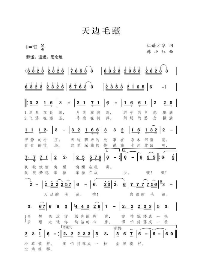 2019年6月,天祝县文联举办了“天边毛藏 心神向往”文艺采风活动,我带着天祝部分文艺创作者走进毛藏乡进行采风创作。期间,我被毛藏的秀美神奇、它远离喧熙的静谧、安详气息深深陶醉。我的故乡旦马草原和毛藏一山相隔,毛藏也是我母亲的故乡。近乡情更切,在毛藏采风的几天时间,我总是想起草原上度过的童年生活,也总是想起母亲无数次向我娓娓讲述的毛藏草原和它的故事,想象母亲在毛藏度过的时光。当时母亲已身患重病,卧床不起了。那几天时间,心中总是氤氲着一种哀酸的情绪,乡愁、母亲、牵挂、毡房……这些最能触动人衷肠的词汇在深心里不停闪现。采风回来后我梳理思绪,想把这次采风过程中的心境和情绪用歌词的方式记录下来,唱给自己,也唱给亲爱的母亲。于是,在那个夜晚一气呵成创作了这首歌词。之后,作曲家韩小红为歌词作曲,《天边毛藏》这首歌就这样和听众见面了。