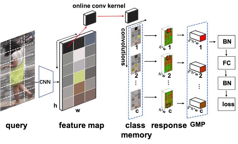 QAConv 训练时的网络结构如图 3 所示,包含骨干网络、QAConv 模块、类别记忆模块、全局最大池化(GMP)、BN-FC-BN 度量学习模块和损失函数。