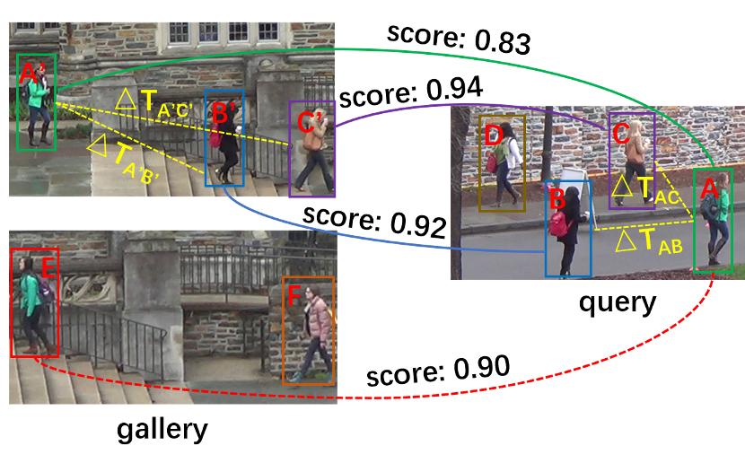 TLift 时序提举的基本假设是在一个摄像头下邻近走过的人,在另一摄像头下很可能仍然是邻近的。示例如图 4 所示,其中,A 是查询图,而在另外的摄像头下,因视角关系 E 比跟 A 是同一个人的 A’ 更像 A。此时,B 和 C 是跟 A 一起邻近走过的人,而他们在另外摄像头下检索到的 B’ 和 C’ 此时就可以作为 A’ 的参考,以此提举 A’ 的匹配分数,因为 A’ 是 B’ 和 C’ 邻近走过的人。相反地,E 的匹配分数会降低,因为没有类似 B’ 和 C’ 的邻近人参考。