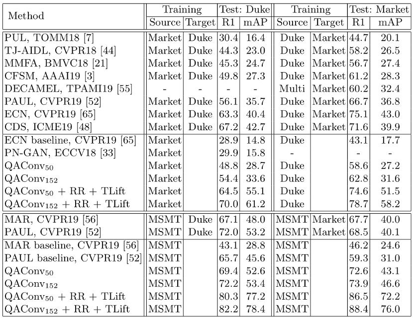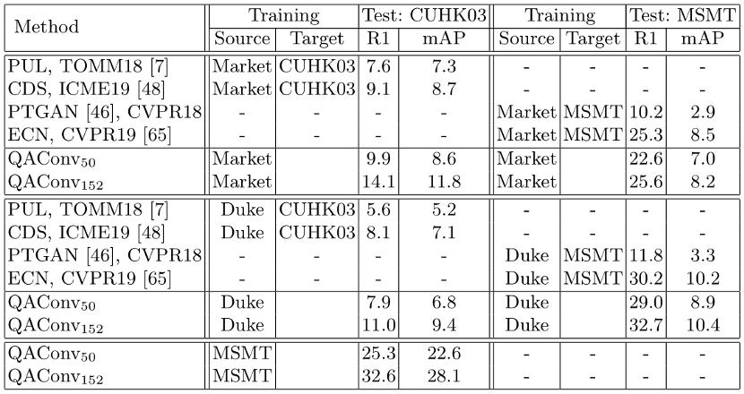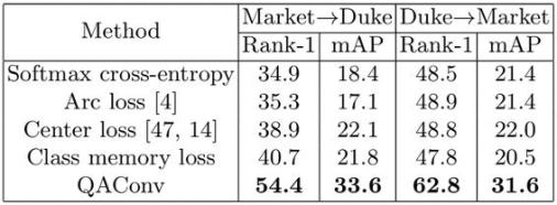 在直接跨库测试的准则下,我们首先对比了常见的分类学习方法和损失函数,如表 1 所示,从中可以看出,QAConv 取得了大幅提升。论文附件进一步对比了 triplet loss 等更多的损失函数,结论类似。因此,可以得出,QAConv 得到的显著提升并不是简单的损失函数改进,而是其匹配机制的改变。