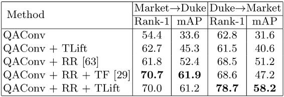 其次,我们对比了一些后处理方法,如表 2 所示。同样可以看出,TLift 的引入大幅提升了行人再辨识的性能。其中,对比方法 TFusion 是基于转移时间分布建模的,它在 Market-1501 数据库上的表现并不太理想,可能原因是该库上复杂的转移模式。而 TLift 规避了转移时间的估计,因此其表现更稳定。