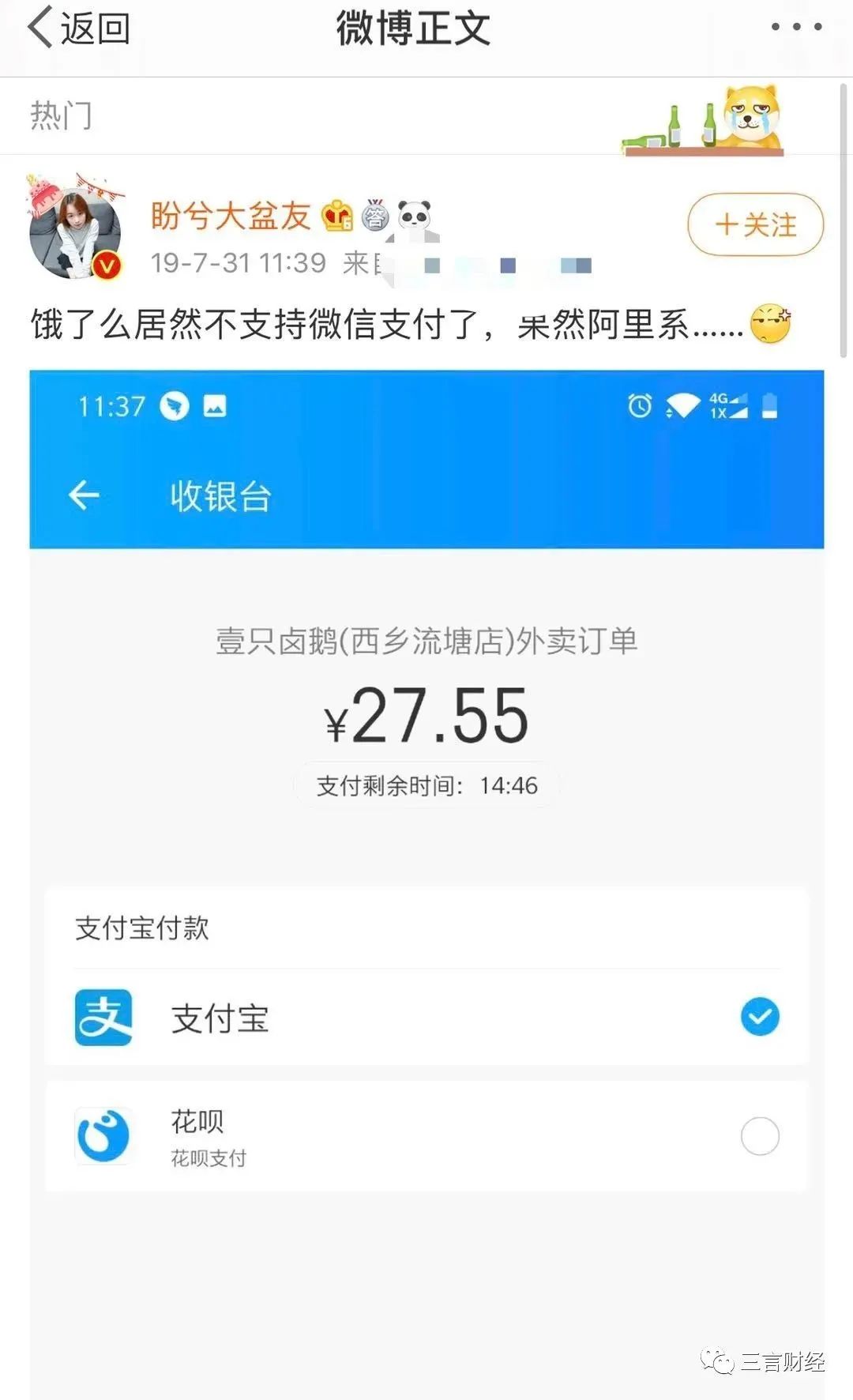 美团、饿了么官方在社交网络隔空回应几番,大概意思也无非是“你也没有XX(支付方式)”。