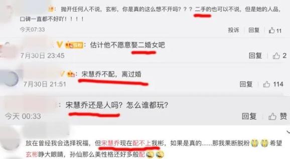 “宋慧乔不配,离过婚”。