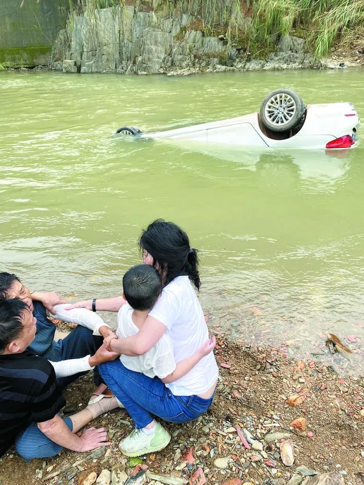 小车瞬间弹飞,四轮朝天坠入路边的源港河后,被湍急河水冲出20多米远,车内严重进水。