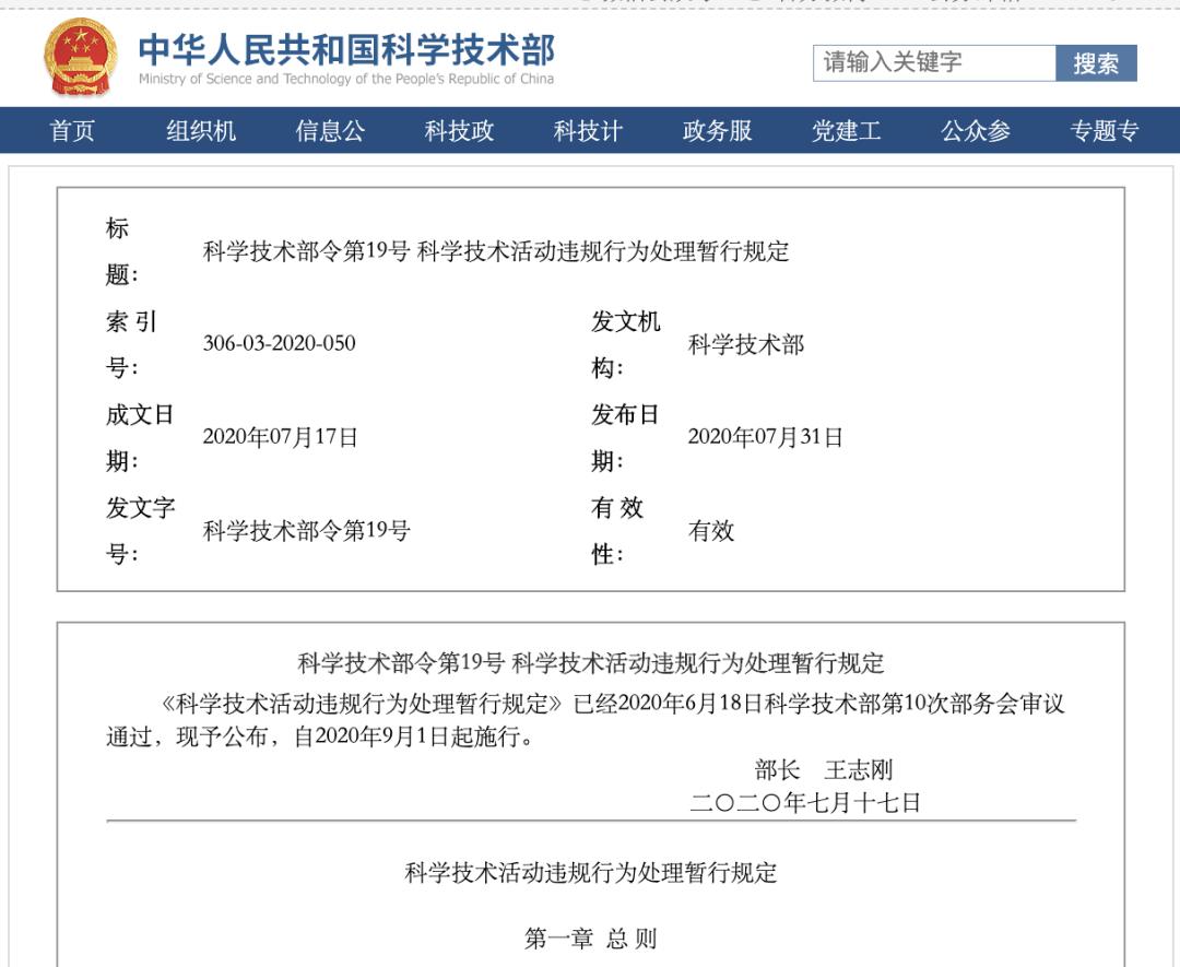 7月31日晚,科技部官网公布《科学技术活动违规行为处理暂行规定》(以下简称《规定》),自2020年9月1日起施行。