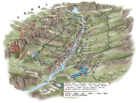 具体游览线路为:游客中心——乘景区换乘车——索道下站广场——乘坐索道上行——索道上站广场——石芽迷宫——悬棺高升——一线天——绝壁栈道——绝壁观景台——中楼门服务点——土司城堡——索道上站下广场观景平台——楼门石浪——小楼门群峰——倒灌水停车场——乘景区换乘车返回游客中心。