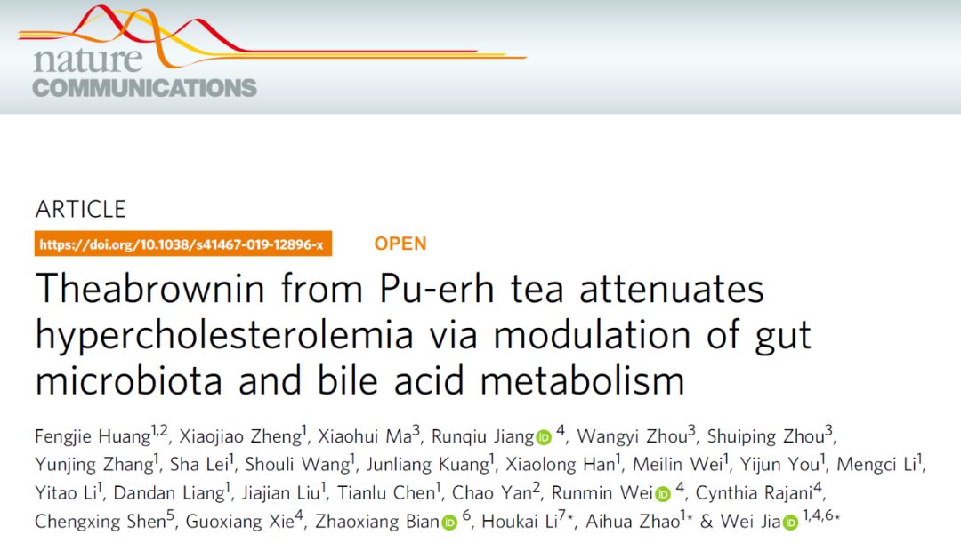 2019年11月,上海交通大学附属第六人民医院贾伟、赵爱华、上海中医药大学李后开作为共同通讯作者,在国际顶尖学术期刊 Nature 杂志子刊 Nature Communications 杂志发表了题为:Theabrownin from Pu-erh tea attenuates hypercholesterolemia via modulation of gut microbiota and bile acid metabolism 的研究论文。
