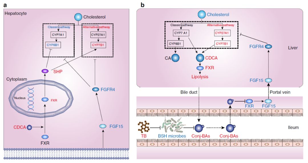 此外,肠道FXR-FGF15信号的抑制伴随着胆汁酸替代合成途径的增加,生成CDCA,激活肝脏FXR并促进脂解。
