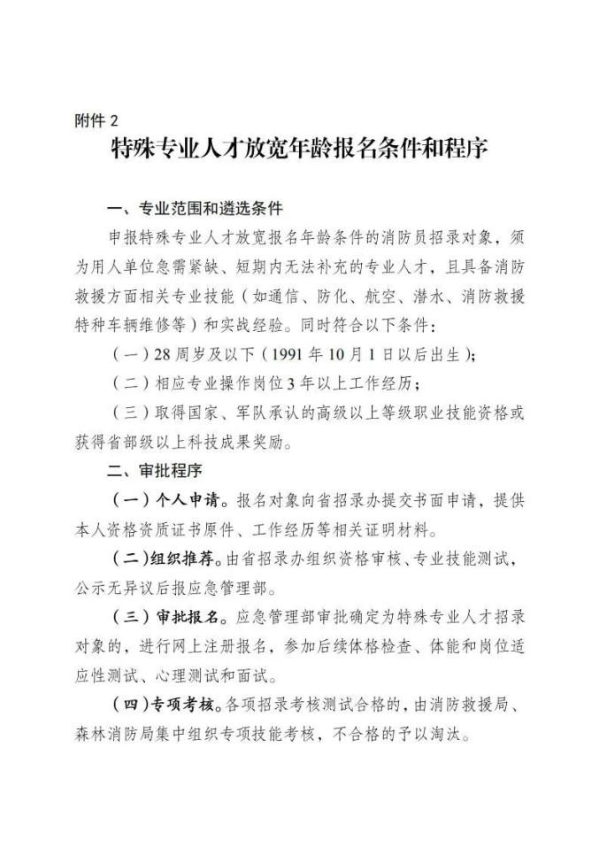 申请特殊专业人才放宽年龄报名的,由本人于9月10日前(以信件寄出邮戳时间为准)向省级消防员招录工作办公室(以下简称“省级招录办”)寄送书面申请和相关证件证书复印件,经省级招录办组织审核、公示并报应急管理部审批同意后,办理网上注册报名。标准条件和办理程序见附件2。