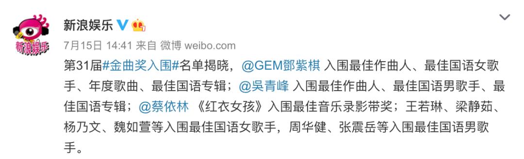 第29届金曲奖颁奖典礼正好撞车创造101的总决赛直播,#林俊杰获得6项提名#,#陈奕迅拿下歌王#...... 在“女团C位”“女团泪奔”的的热搜下,显得弱小、无助又可怜。