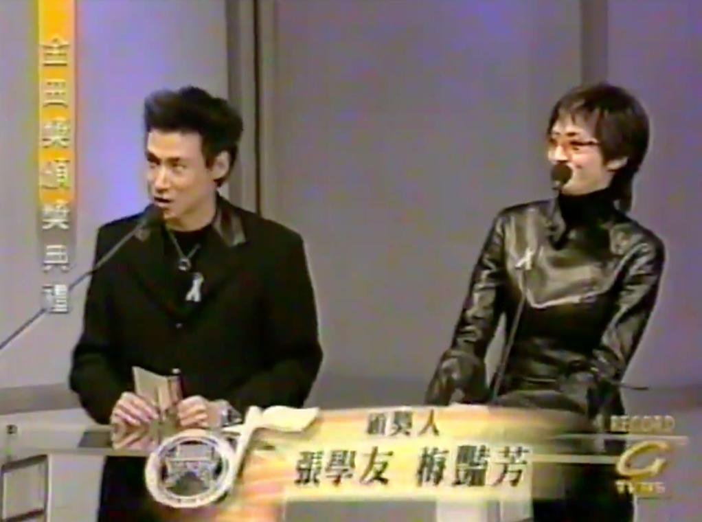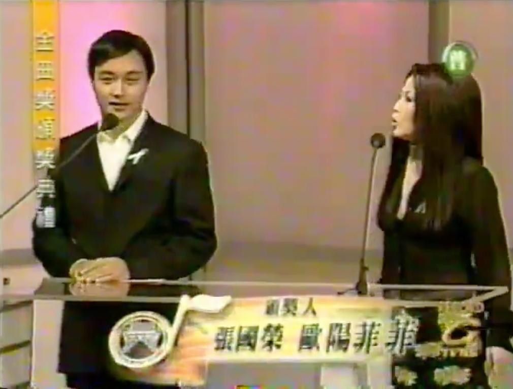 张国荣与欧阳菲菲为最佳流行音乐演唱专辑奖的获得者范晓萱颁奖。