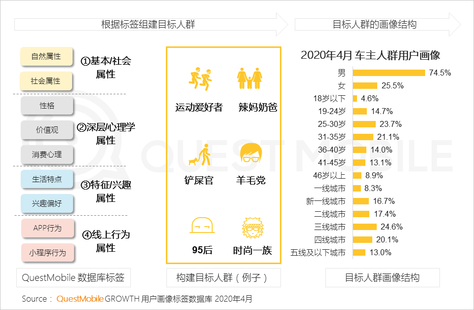 2、对于如何获取目标客群的精准画像,可通过标签组合,基于数据挖掘获取用户属性和线上触媒偏好