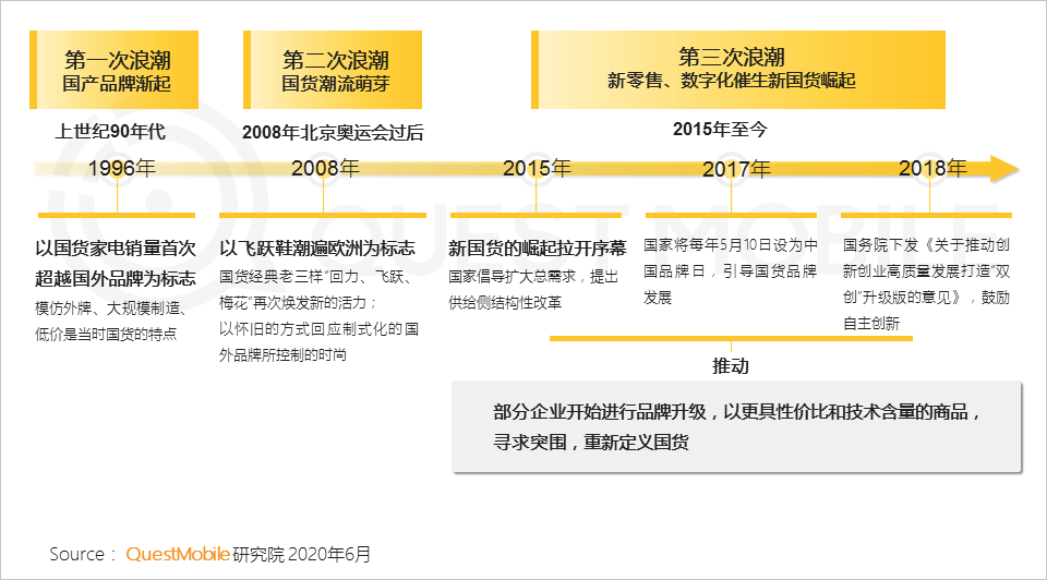 2、国产品牌历经三次浪潮,从无到有,承担着“中国制造”向“中国创造”转型升级,新国货崛起就此拉开序幕