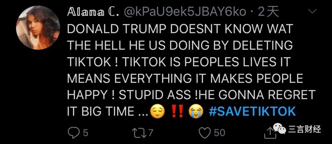 有网友称,“特朗普根本不知道封杀TikTok意味着什么!人们靠TikTok活着!它带给人们快乐,他是大家的全部!特朗普一定会后悔!”