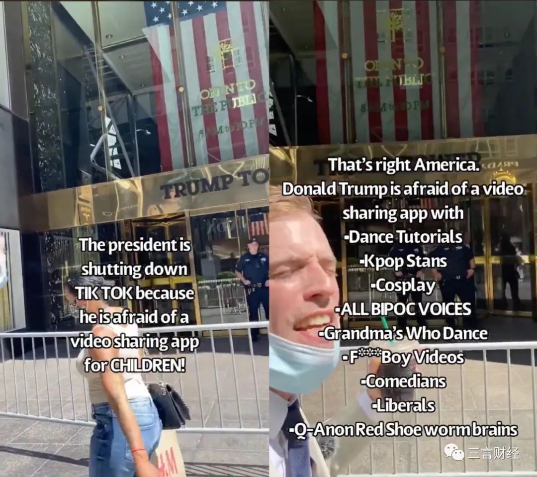 有美国网友发布了一则嘲讽特朗普封杀TikTok的视频。视频中这名网友在美国特朗普大厦前,冲着门口的安保人员大喊道:特朗普害怕一款娱乐休闲性质的应用,这就是你们的总统!