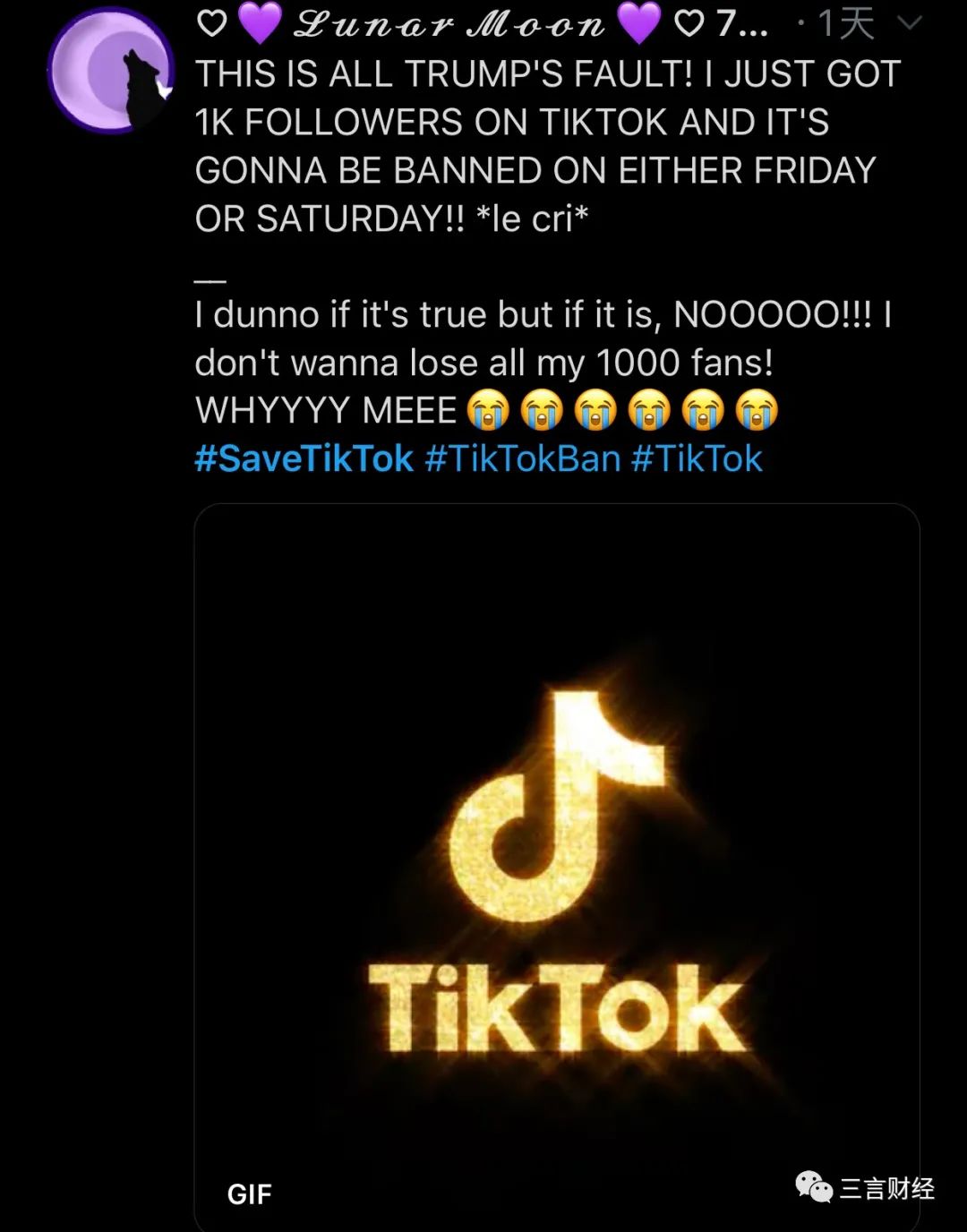 有网友发帖称自己TikTok粉丝刚达到1000人,实在不想就这样被封杀了。