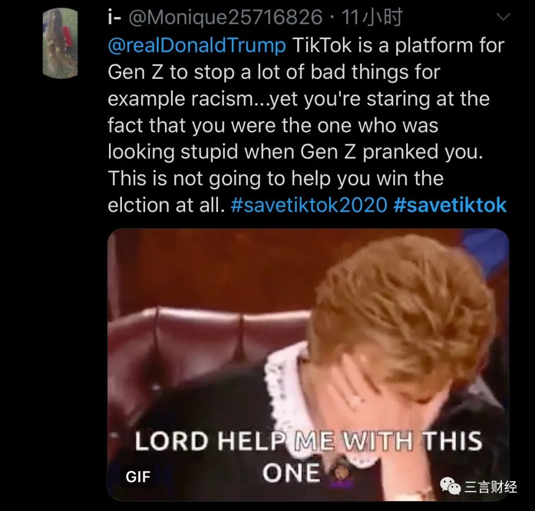 还有网友强调,TikTok对Z世代(指在智能时代成长的人们,即出生于1995年至2005年间的人)的年轻人帮助甚大,例如反种族主义。但是特朗普却反其道而行之,这对其选举并无帮助。
