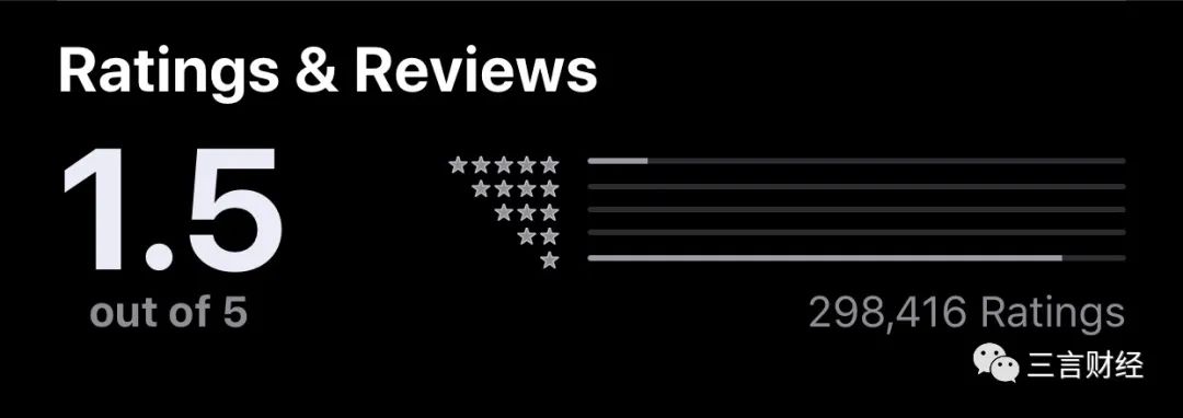根据Sensor Tower 商店情报数据显示,其当时在苹果商店的排名一下从第486位升至第2位。此后,苹果方面一度删除部分差评,但即使如此,目前该App仍然只有1.5星,共计29.8万条评价。