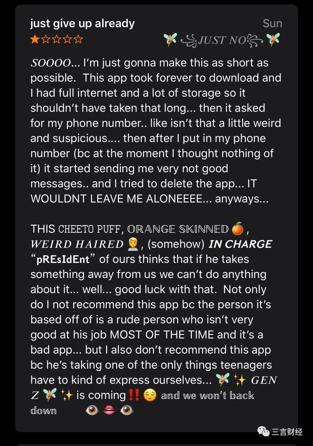 有网友在评价开头强调自己并不是“想要恶意下架这款App的Z世代年轻人”,但是特朗普竞选App体验极差,下载完成后,自己的手机就开始“无限崩溃”。