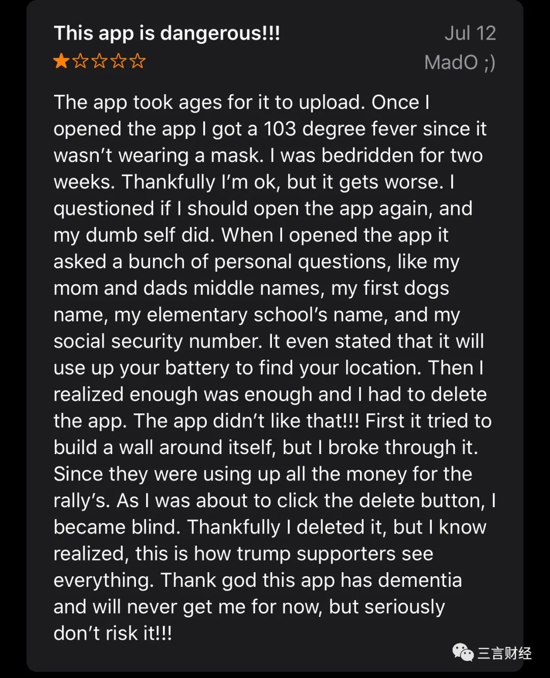 还有的评价内容则完全是杜撰故事来嘲讽特朗普了。比如这位网友评论称,当自己打开这款App时自己立刻高烧103度,因为“App没有戴口罩”。不得不隔离14天,但是好在身体恢复健康。这款App还问了一堆个人信息,包括父母中间名、自己的宠物狗名字。之后,App甚至还尝试查找手机位置。