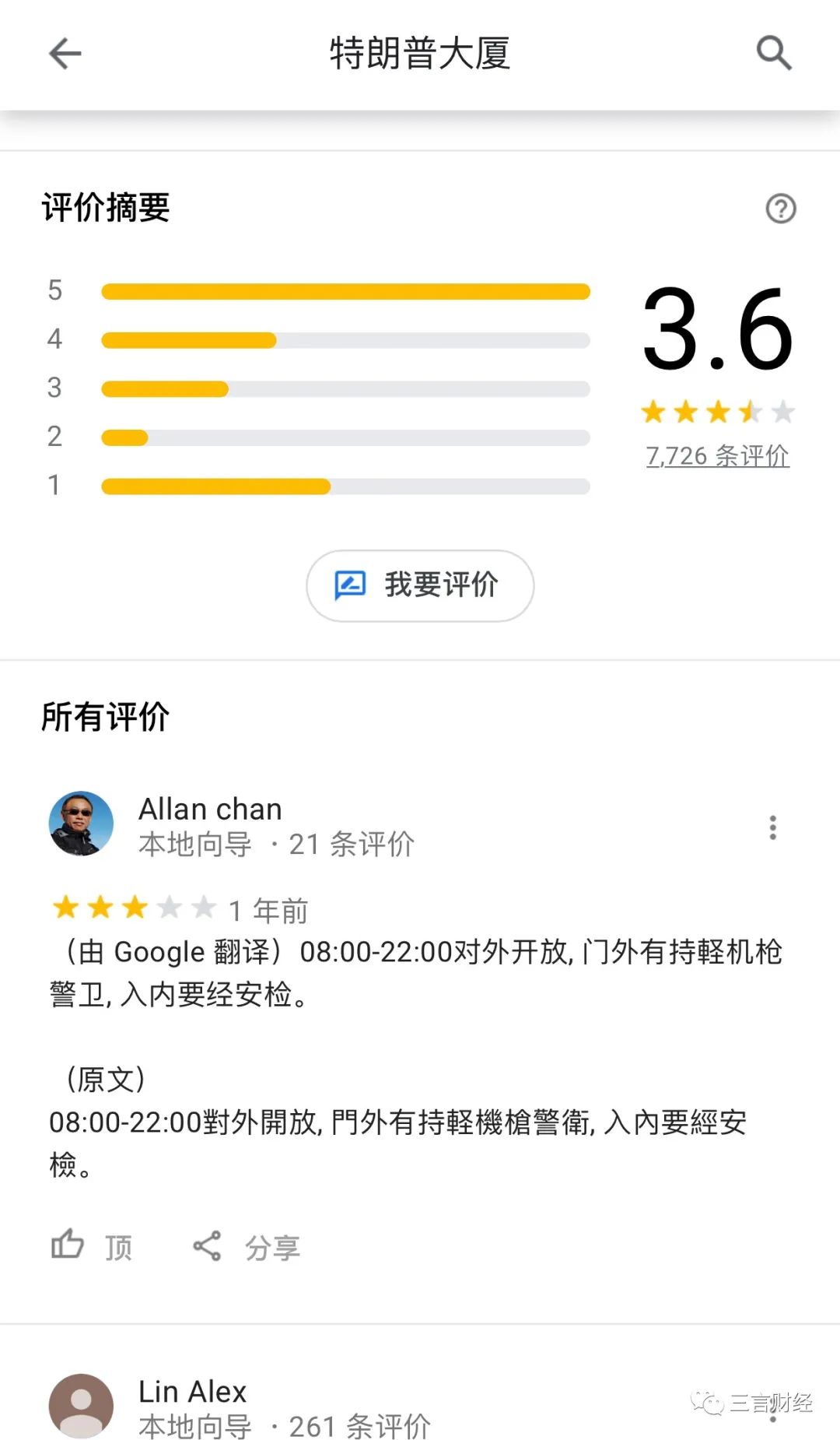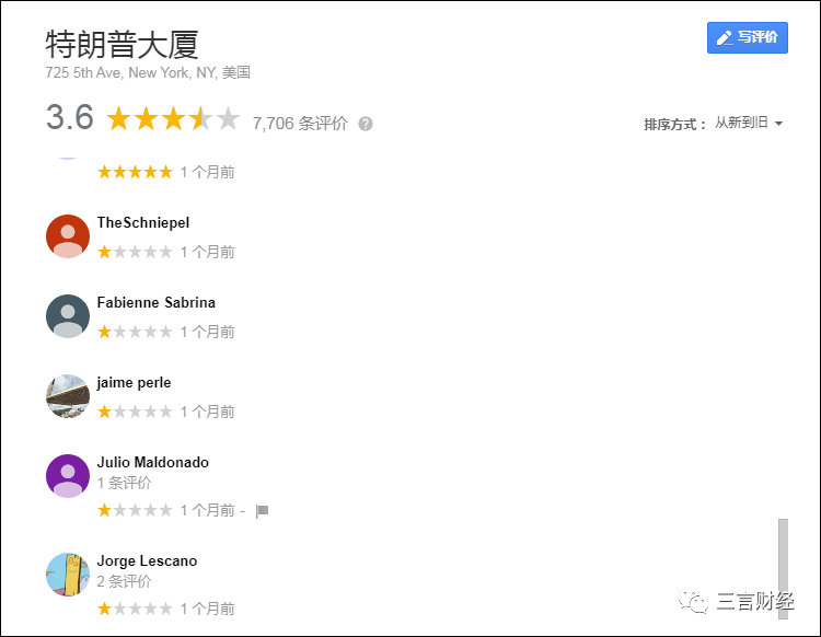 三言财经发现,谷歌地图纽约特朗普酒店最新评价总分3.6分,共7000余条评价,但最新评价时间为一年前。