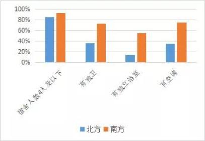 这个调查分别对比了南北方研究生宿舍中的“四人间以下”、“独卫”、“独立浴室”、“空调”等对学生们来说较有吸引力的条件,从图中可以看出,这几个方面,南方宿舍都好于北方宿舍。