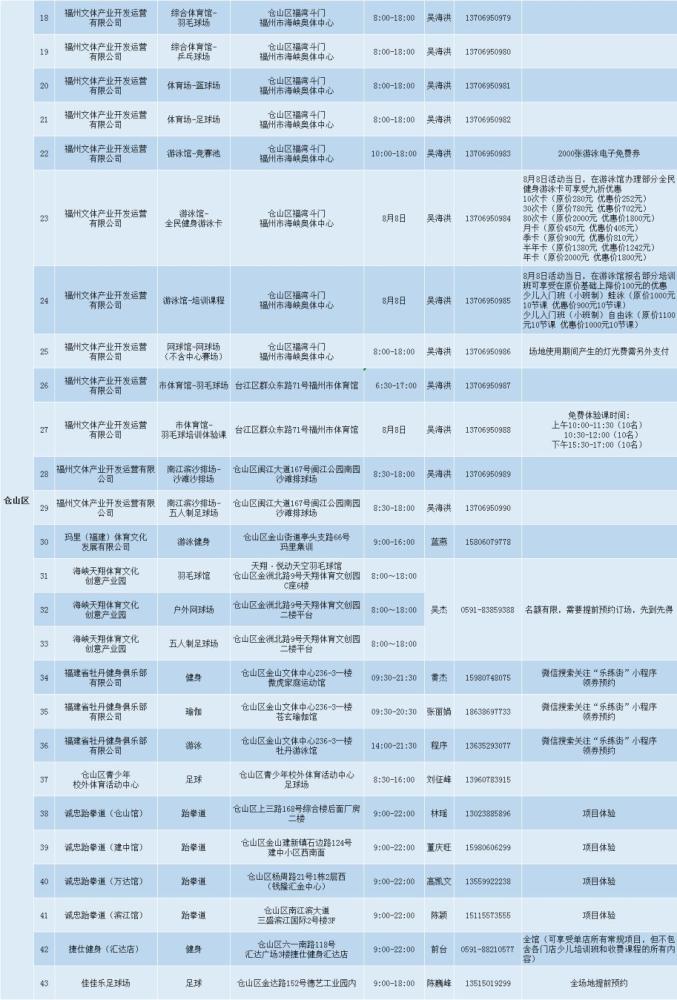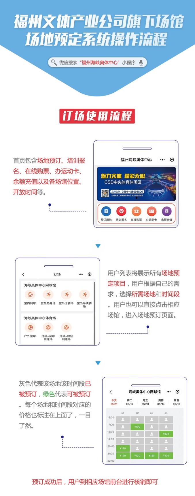 3.全民健身日场地预约时间为2020年8月1日至2020年8月7日,通过海峡奥体中心公众号进行线上场地预订。