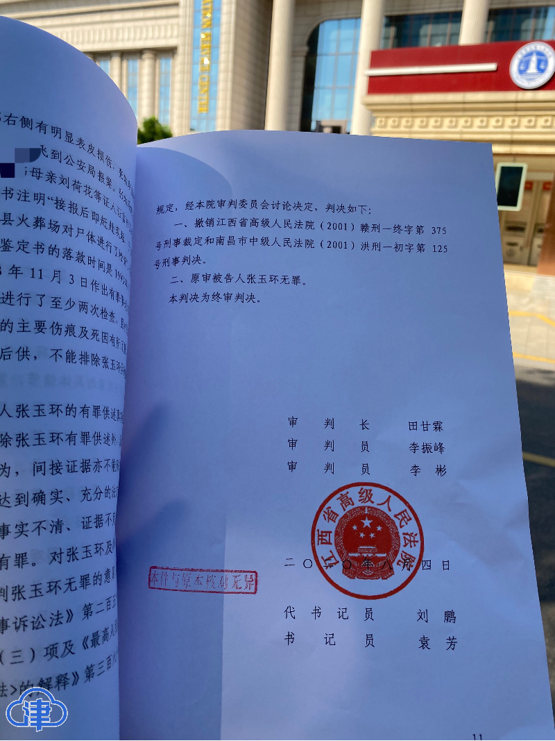 今年7月9日,张玉环等了27年的再审在江西高院第四审判庭公开开庭审理。庭审中,检、辩双方均认为,张玉环的有罪供述存疑,原审认定的证据不能证明张玉环实施了犯罪行为,建议改判无罪。8月4日下午16点,江西张玉环故意杀人案在江西高院公开开庭宣判:张玉环无罪。