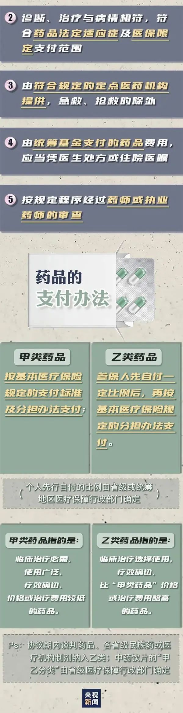 第五条 《药品目录》由凡例、西药、中成药、协议期内谈判药品和中药饮片五部分组成省级医疗保障行政部门按国家规定增补的药品单列为维护临床用药安全和提高医保基金使用效益,《药品目录》对部分药品的医保支付条件进行限定。
