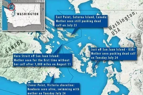 鲸群渐渐散去,但 Tahlequah 却没有跟着离开,它托着死去的孩子,独自在海面上开始了一场漫长的悼念之旅。