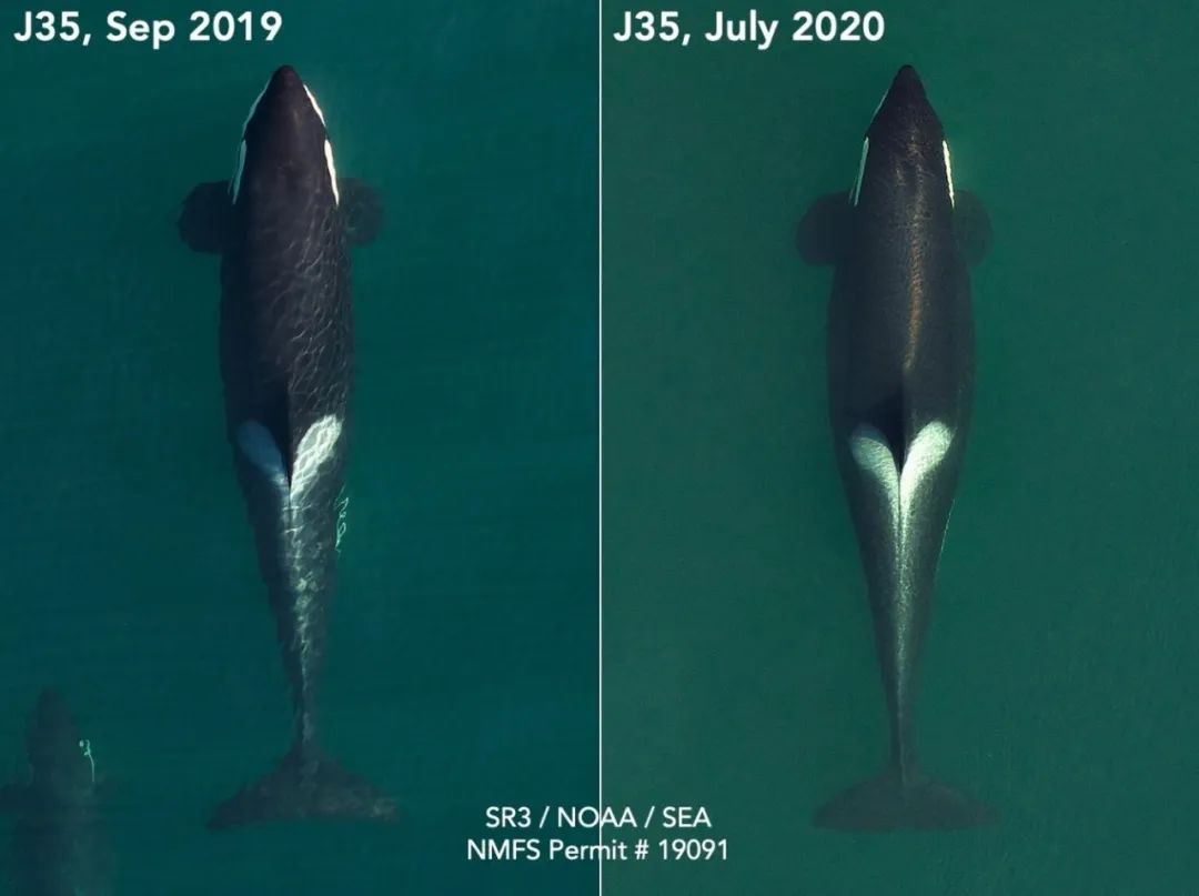 科研人员一直通过无人机对虎鲸群体的身体状况和生存状态进行追踪,而就在今年,终于传来了一个好消息:在虎鲸宝宝去世的两年后,Tahlequah 又怀孕了。