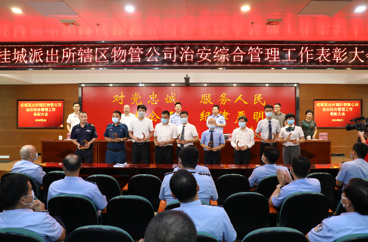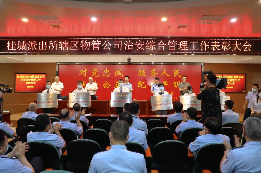 8月3日,桂城派出所召开物业管理公司治安综合管理工作表彰大会,对2019年在安防队伍建设、治安防控管理等方面表现突出的物业管理公司进行表彰,并颁发奖牌。