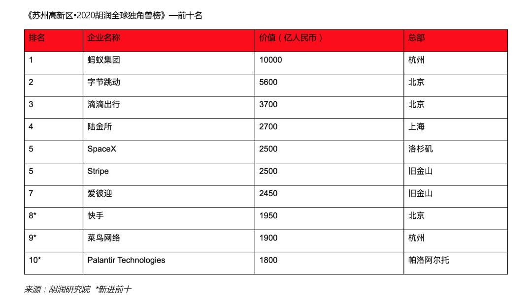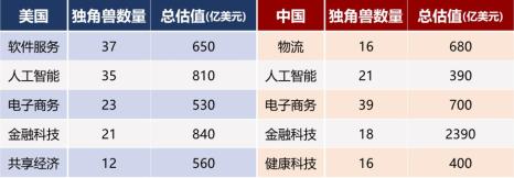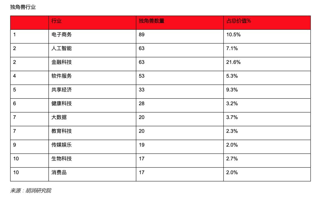 前十名占全球独角兽企业总价值的28%,全部来自美国或中国。