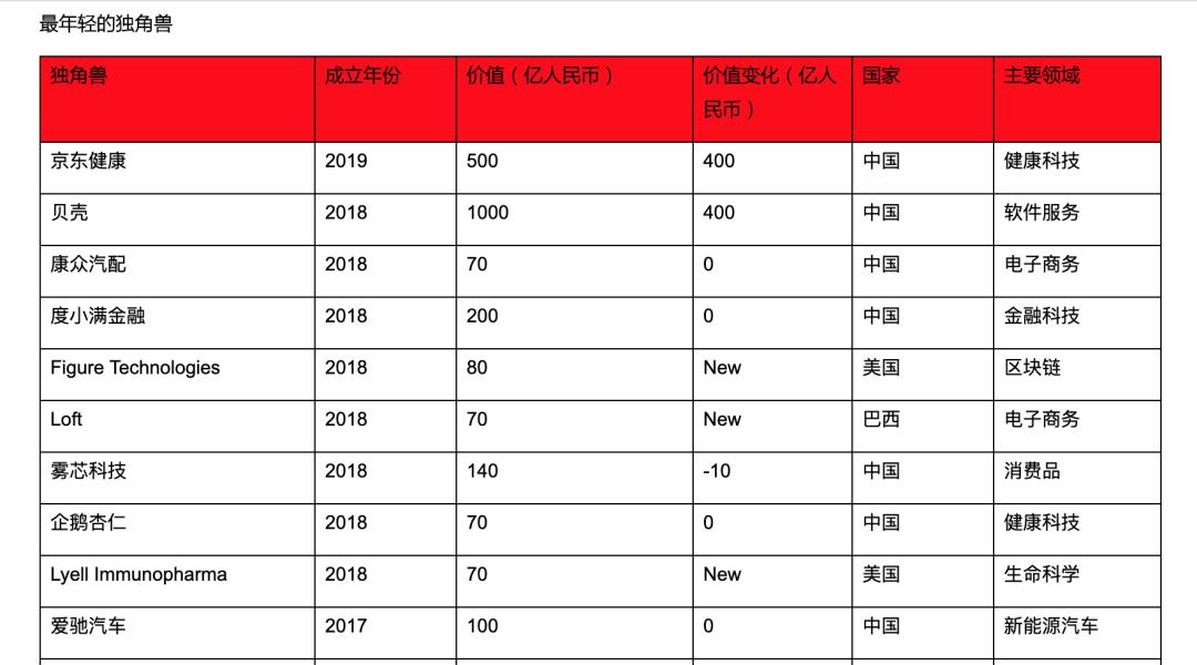 600余家上榜独角兽的平均年龄为9岁。33家成立不到3年,其中一半以上来自中国。去年从京东拆分出来的京东健康是榜单上最年轻的独角兽。8家成立不到2年,其中5家来自中国:贝壳、康众汽配、度小满金融、雾芯科技和企鹅杏仁。胡润表示:“在后瑞幸咖啡时代,投资者现在对管理能力和系统更加在意。”
