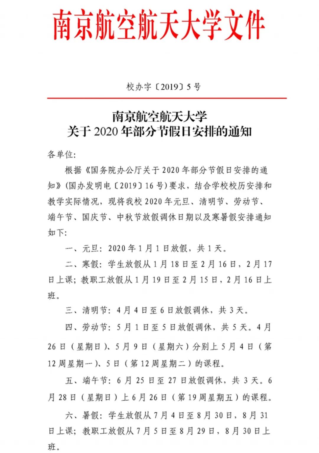 1.推迟本科生2019-2020学年第三学期教学安排。原定8月8日、8月9日本科生返校报到,8月10日开始2019-2020学年第三学期的教学活动因疫情推迟。开学及返校时间根据疫情情况而定,提前一周通知。在没有接到学校正式通知前,本科生一律不得返校。依照开学时间调整,统筹安排2019-2020学年第三学期和2020-2021学年第一学期教学活动;2019-2020学年第二和第三学期线上已完成教学任务、未进行考核的部分课程通过线上完成期末考试;2020年转专业、专业分流、研究生推免等工作暂安排到学生返校后进行。