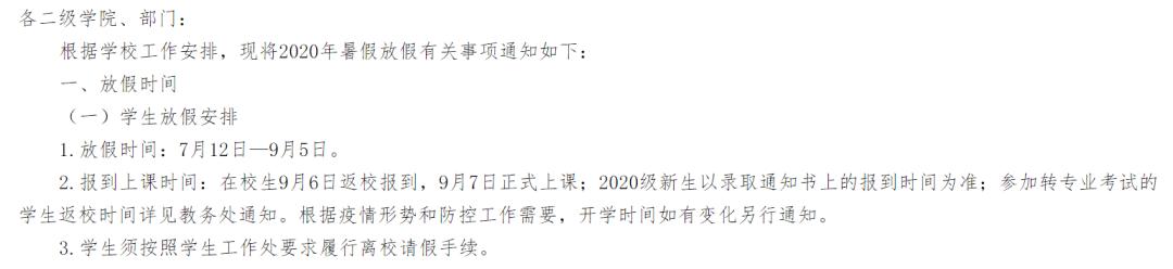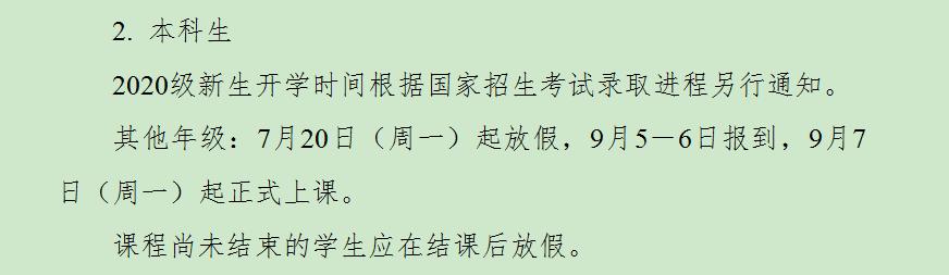 2020级本科新生于9月8日至10日报到注册,9月11日至13日入学教育,9月14日至27日军训,9月28日正式上课。本科生老生具体返校时间学校另行通知,未接到学校正式返校通知一律不得返校。