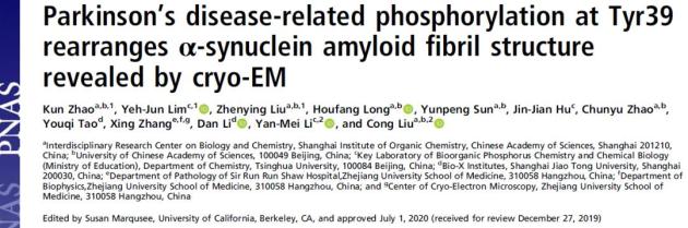 近日,上海有机化学研究所生物与化学交叉中心刘聪与清华大学李艳梅课题组合作,发现在帕金森病患者富集的α-syn 39位Tyr磷酸化修饰 (pY39) 对于α-syn的液-固相转化以及致病淀粉样聚集具有重要的调控作用,并进一步阐释pY39磷酸化介导α-syn形成病理性聚集体的分子机制和结构基础。相关的工作发表于PNAS上,题为:Parkinson’s disease-related phosphorylation at Tyr39 rearranges α-synuclein amyloid fibril structure revealed by cryo-EM。