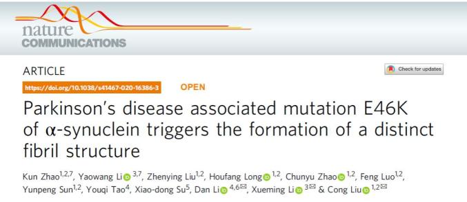 另外值得一提的是,刘聪课题组与上海交通大学Bio-X的李丹课题组长期合作进行α-syn液-固相转化的调控及其在帕金森病中的作用的研究。除了本工作报道的PTM调控α-syn聚集的研究之外,近期还与清华大学李雪明以及北京大学的苏晓东课题组,合作系统研究了不同的帕金森病家族性遗传突变(A53T及E46K)对于α-syn液-固相转变以及致病淀粉样聚集组装结构与毒性的影响。相关工作阐释了研究了不同的家族性遗传单点突变直接影响α-syn淀粉样纤维聚集的组装模式以及动力学特征,从而导致更强的细胞毒性。为α-syn家族性点突变引起早发性帕金森病的研究提供了新的思路。相关工作分别与2020年3月,4月发表在Cell Research 以及Nature communications 上。 综上,刘聪课题组的系统研究为阐释病理条件下遗传以及环境因素对于蛋白质相分离以及致病性淀粉样聚集体的调控及其在帕金森病中的致病作用的分子机制提供了坚实的基础。