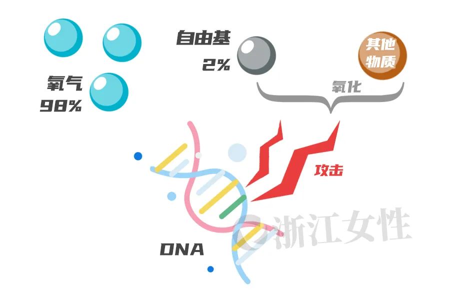 皮肤专家表示,虽然98%的氧气是友好的,但仍然有2%的氧气会形成自由基,自由基很容易与其他物质发生化学反应(这个过程叫氧化)。它们攻击我们的DNA,损害胶原蛋白,加速皮肤老化。随着年龄的增大,自由基还会导致黑色素沉积。