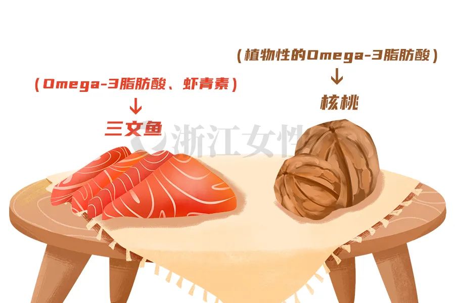 三文鱼还有大量的虾青素,抗氧化能力是维他命E的数百倍,能有效抗击自由基,保护皮肤免受紫外线的伤害。不爱吃鱼的话,可以改吃核桃,当作植物性的Omega-3脂肪酸来源。