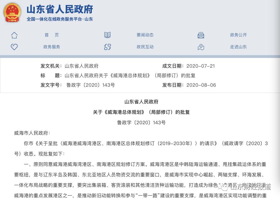 山东省政府网站信息,近日,山东省政府发布关于《威海港总体规划》(局部修订)的批复(鲁政字〔2020〕143号)。