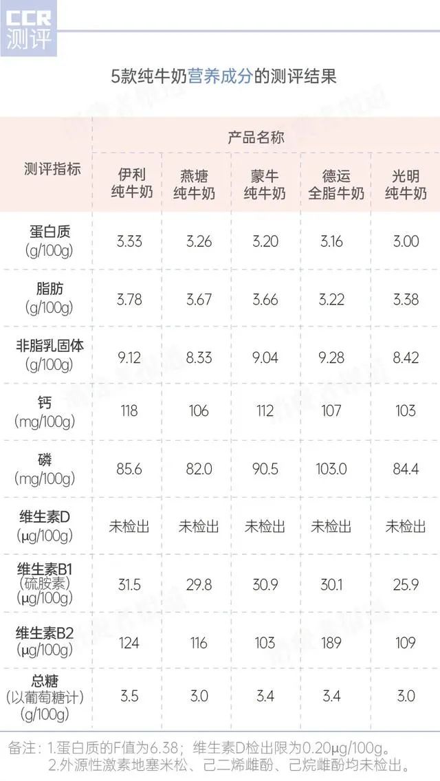 测评的结果显示,脂肪含量、蛋白质含量高的品牌是燕塘和伊利;钙含量高的是蒙牛和伊利;非脂乳固体和维生素B2含量高的是进口品牌德运;综合比较来看,纯牛奶蛋白质含量略低的品牌只有光明,不过依然在标准之上。