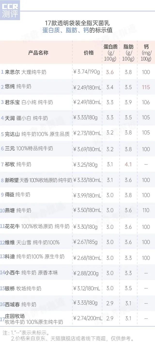 而且早在10年前即2010年,生鲜牛乳的国家标准里,蛋白质含量标准就下调到了2.8g/100g。但是在测评中,所有品牌的蛋白质含量均超过了3.0g/100g。