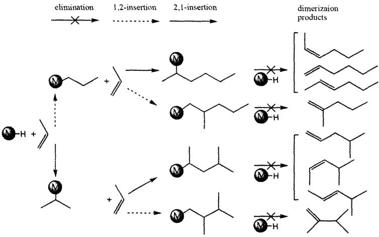 丙烯的结构是不对称的,丙烯的双键加成,1,2和2,l位带来不同的产物结构,含有过渡金属的均相催化剂中,过渡金属是丙烯二聚反应的活性中心,二聚产物六碳烯烃异构体选择性的大小是丙烯分子在活性中M-H上的插入方式的不同引起的,聚合是发生在双键上的,一个σ键和一个π键,二聚反应过程主要包括 1,2-插入、2,l-插 入和β-H消除,如果丙烯分子先经过1,2-插入到活性中心N i—H后,再进行 2,1-插入 ,最后经消除反应得到己烯,如果丙烯分子按照先对活性中心Ni—H进行2,1-插入,然后再进行 1,2一插入,就得到 2,3-DMB ,可见过渡金属在活性物种上的化学环境直接影响着二聚反应的历程。