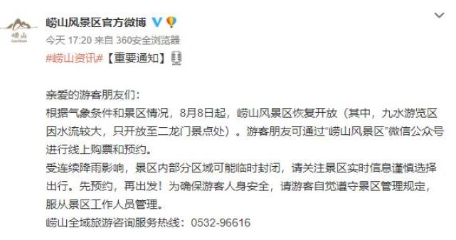 根据气象条件和景区情况,8月8日起,崂山风景区恢复开放(其中,九水游览区因水流较大,只开放至二龙门景点处)。游客朋友可通过“崂山风景区”微信公众号进行线上购票和预约。
