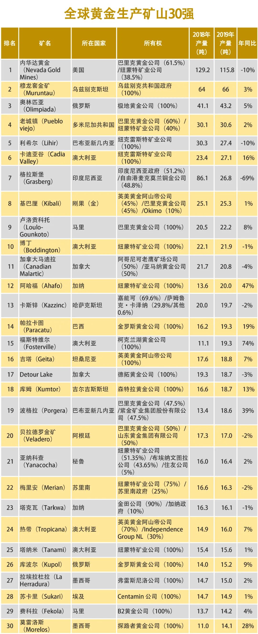 近日发布的《全球黄金年鉴2020》(中文版)对世界黄金矿业去年的基本情况进行了详细介绍。其中。全球黄金矿山生产数据展示了过去一年全球各个黄金矿业公司旗下矿山生产的状况。2019年全球矿产黄金产量于10年来首度下降,减产28吨(降幅为0.8%),至3534吨。2019年全球黄金矿业的生产成本连续第三年上升,全行业总现金成本和总维持成本的均值至每盎司704美元和每盎司941美元。同时,《年鉴》公布了2019年全球黄金生产矿山排名。